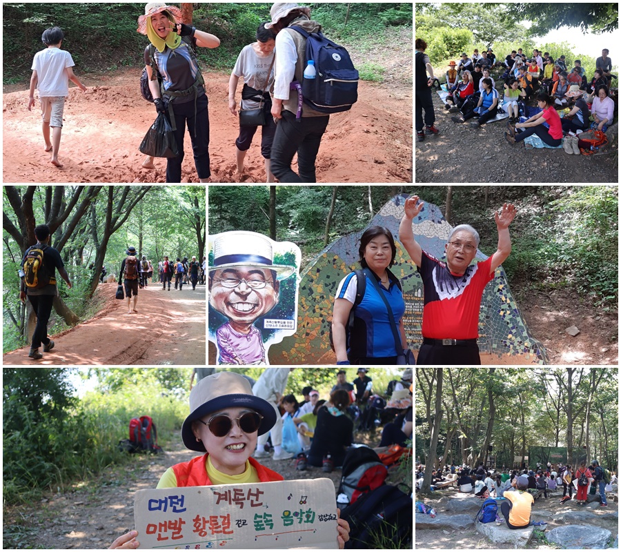 대형버스 한 대 준비하고(일정 확정시 바로 예약 함~아주 빠르게), 30명은 버스로 4명은 개인차로 대전 계족산을 향해 버스 나들이를 떠났다. A팀 16명이 용화사 입구에 내려 주차장에서 계족산성으로 오는 코스, B팀 총18명은 장동산림욕장을 출발해 황톳길 걸으며 계족산성으로 가는 코스로 나뉘었다. 중간에 휴식하거나 발 씻는 시간을 포함해 넉넉히 시간을 배정하였지만, 황톳길 코스가 길어 임도삼거리까지는 갔다 오지 못했다.