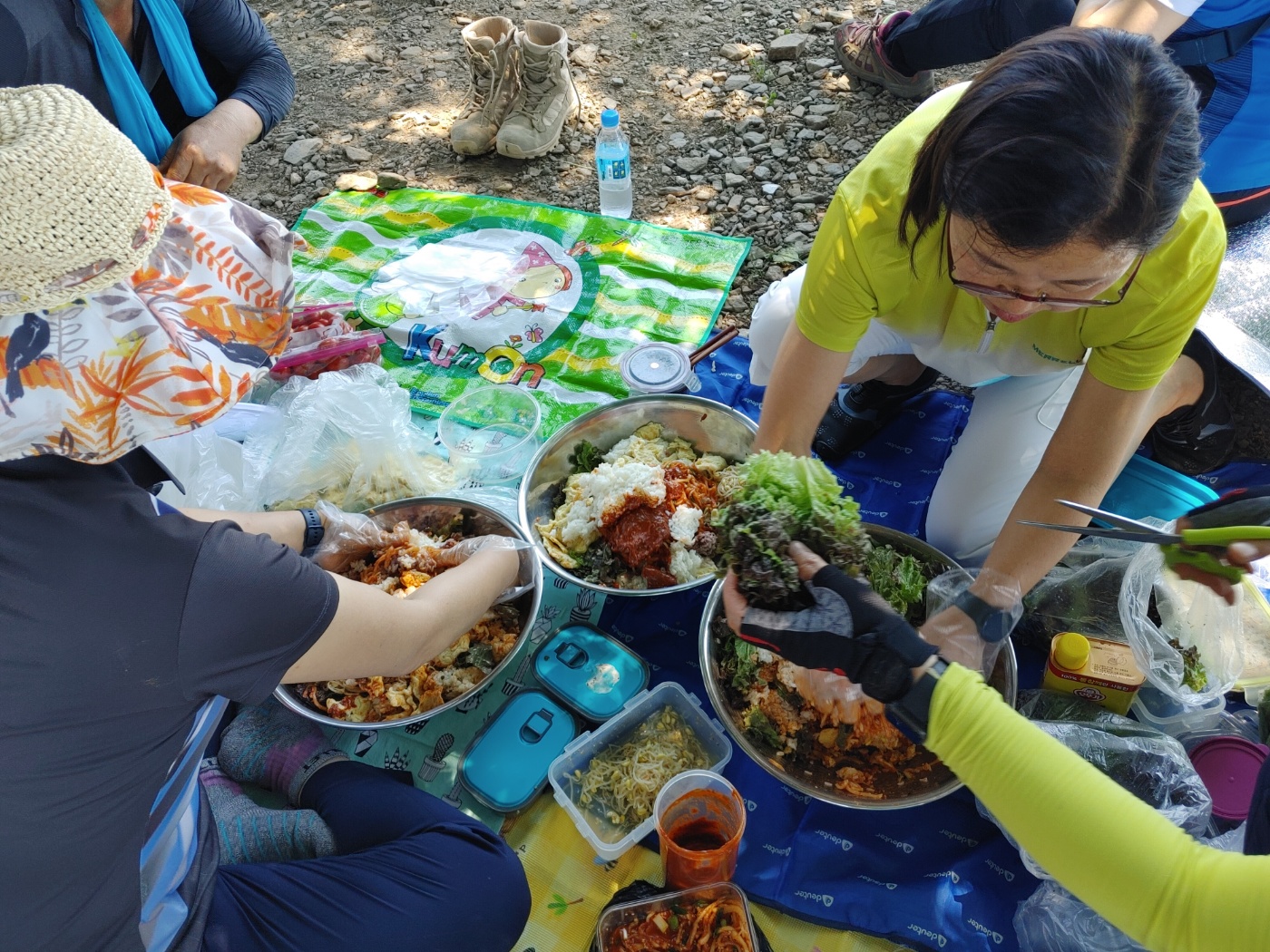 몇몇 회원님들 일찍 일어나 나물을 무치고 볶고, 무거웠을 짐 보따리를 풀어 헤친다. 각자 싸온 맨밥을 넣어 34명이 먹을 비빔밥을 삼삼오오 둘러앉아 쓱쓱 비빈다. 힘겹게 산성을 올라온 이들은 밥 맛도 더 좋았을터, 둥근 양푼에 둥글게 버무려진 점심 식사와 휴식... 꿀 맛이었다.