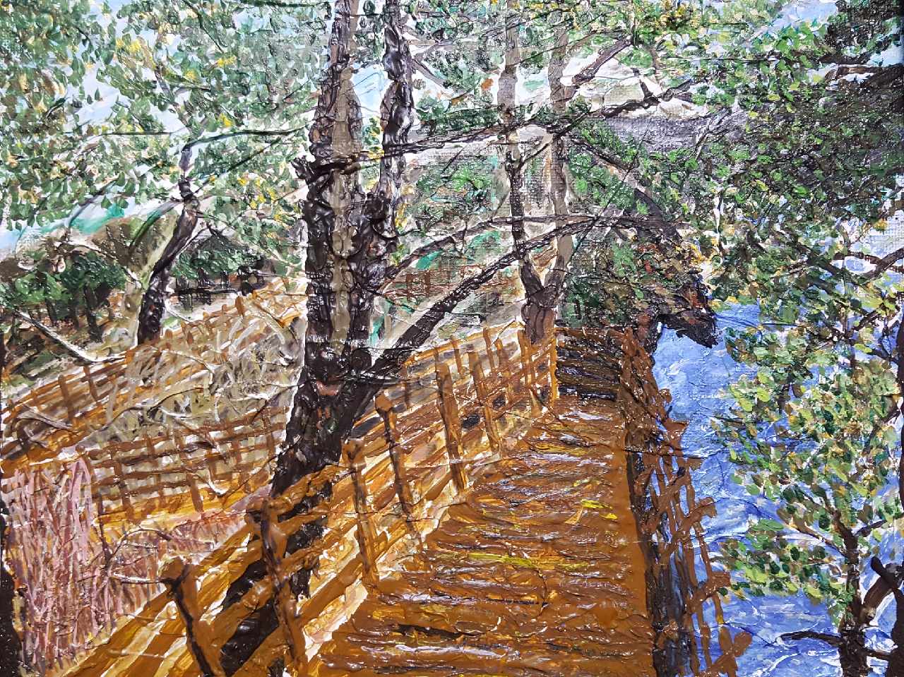 설연휴에 친구랑 간 운암호 산책길을 그렸어요. 배경을 먼저 그려야 하는데, 깜빡하고, 나무와 데크를 먼저 그렸어요. 배경을 나중에 그리느라 애먹었어요. 오른쪽 위 나뭇가지 뒤로 섬이 희미하게 보여야 하는데, 잘 표현이 안 됐어요.