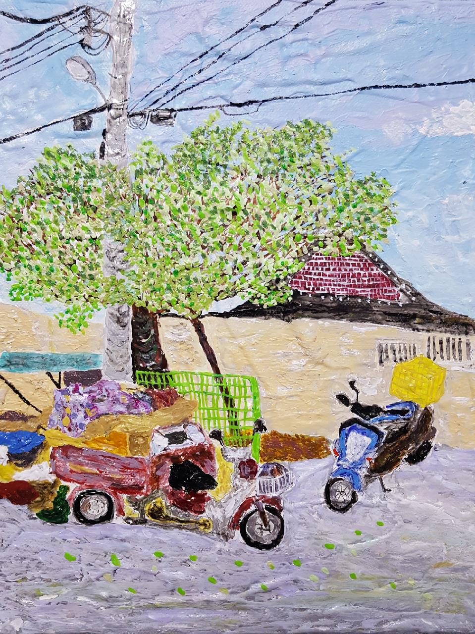 전주 인후동 골목길 풍경이요, 나무 아래 폐지 줍는 수레를 그렸어요. 폐지 줍는 분들에게는 폐지가 소중해서 밝고 환하게 표현했어요.