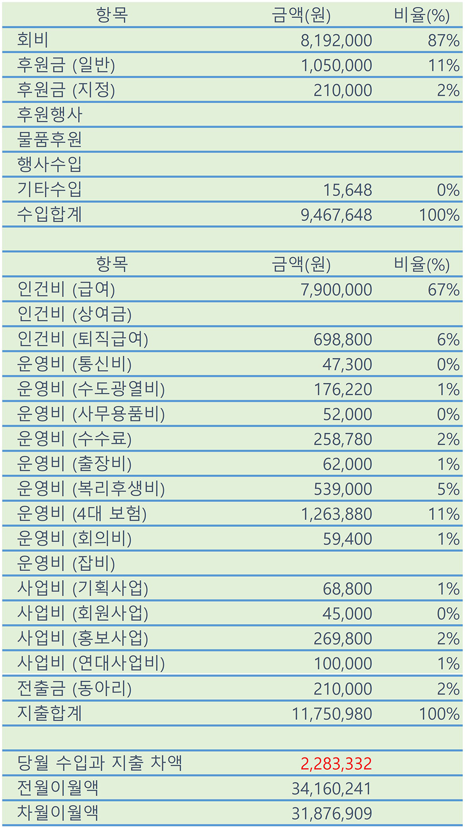 - 수입내역 : 일반후원금 이상민(100만) 박바로가(5만)