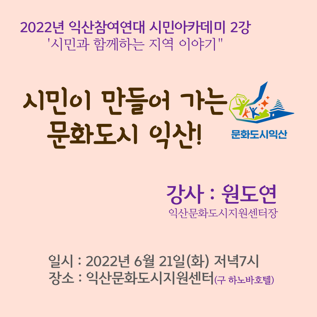 2022년 익산참여연대 지방자치연구회가 진행하는 시민 아카데미 “시민과 함께하는 지역 이야기” 두 번째 강좌를 진행합니다.