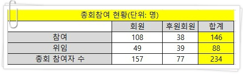 성원 375명(회원 298명, 후원회원 77명) 중 투표참여 146명, 위임 88명으로 234명이 참여하여, 의결정족수 188명을 충족하였습니다.