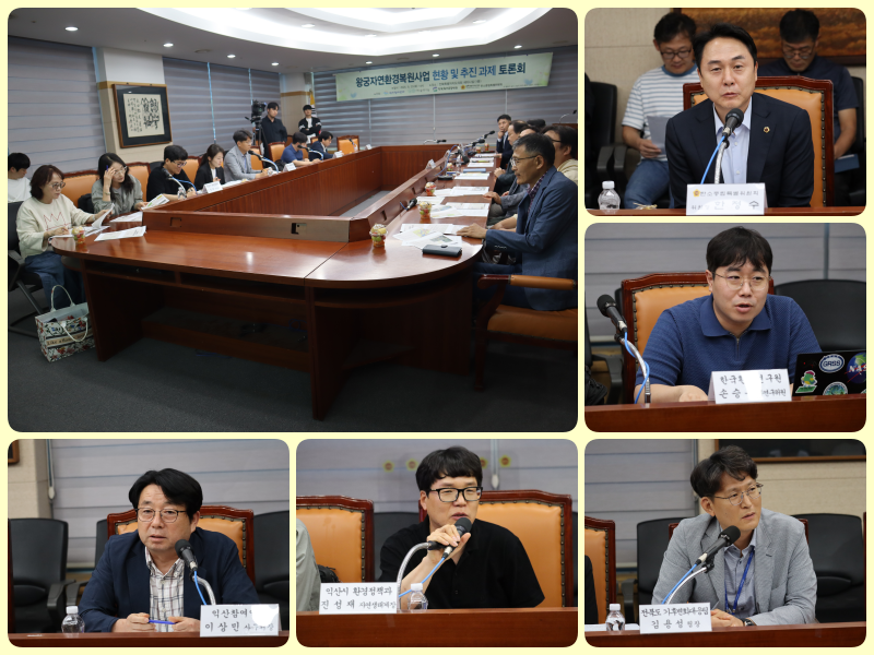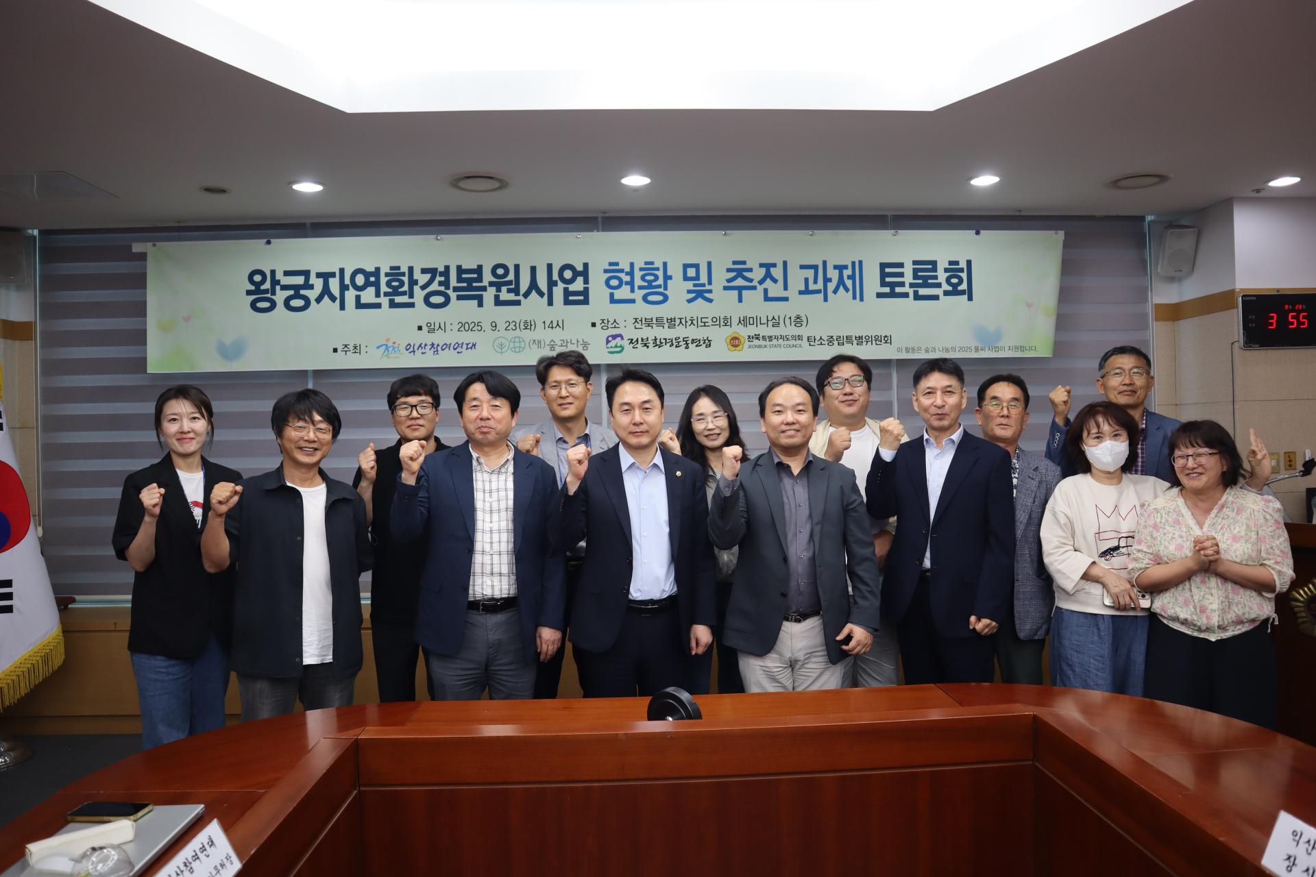 익산참여연대, 전북환경운동연합, 전북특별자치도의회 탄소중립특별위원회가 공동으로 주관한 '왕궁자연환경복원사업 현황 및 추진과제 토론회'가 처음으로 9월 23일 오후 2시 전북특별자치도의회 1층 세미나실에서 열렸다. 토론회 1부에서는 천정윤 전북연구원 책임연구위원이 '왕궁자연환경복원사업'의 주요 내용과 추진 현황 발제, 2부 지정토론에서는 문지현 전북환경운동엽합 사무처장 사회로 손승우 한국환경연구원 부연구위원, 김용성 전북특별자치도 기후변화대응 팀장, 진성재 익산시 자연생태계장, 한정수 전북특별자치도의회 탄소중립특별위원장, 이상민 익산참여연대 사무처장 등이 참여하여 사업의 성공적인 추진을 위한 심도 있는 논의를 진행했다.