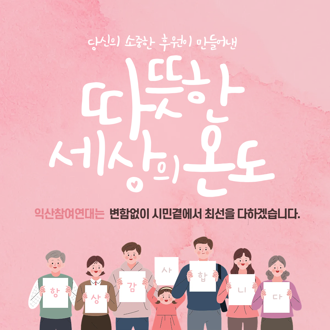 26살 청년으로 성장할 수 있었던 것은 회원, 시민들이 관심과 참여로 함께 해주셨기 때문입니다. 이런 마음이 모아져 정부와 지자체의 보조금을 받지 않고도 지속적인 활동을 이어올 수 있었습니다. 회원, 시민분들이 익산참여연대의 힘입니다.