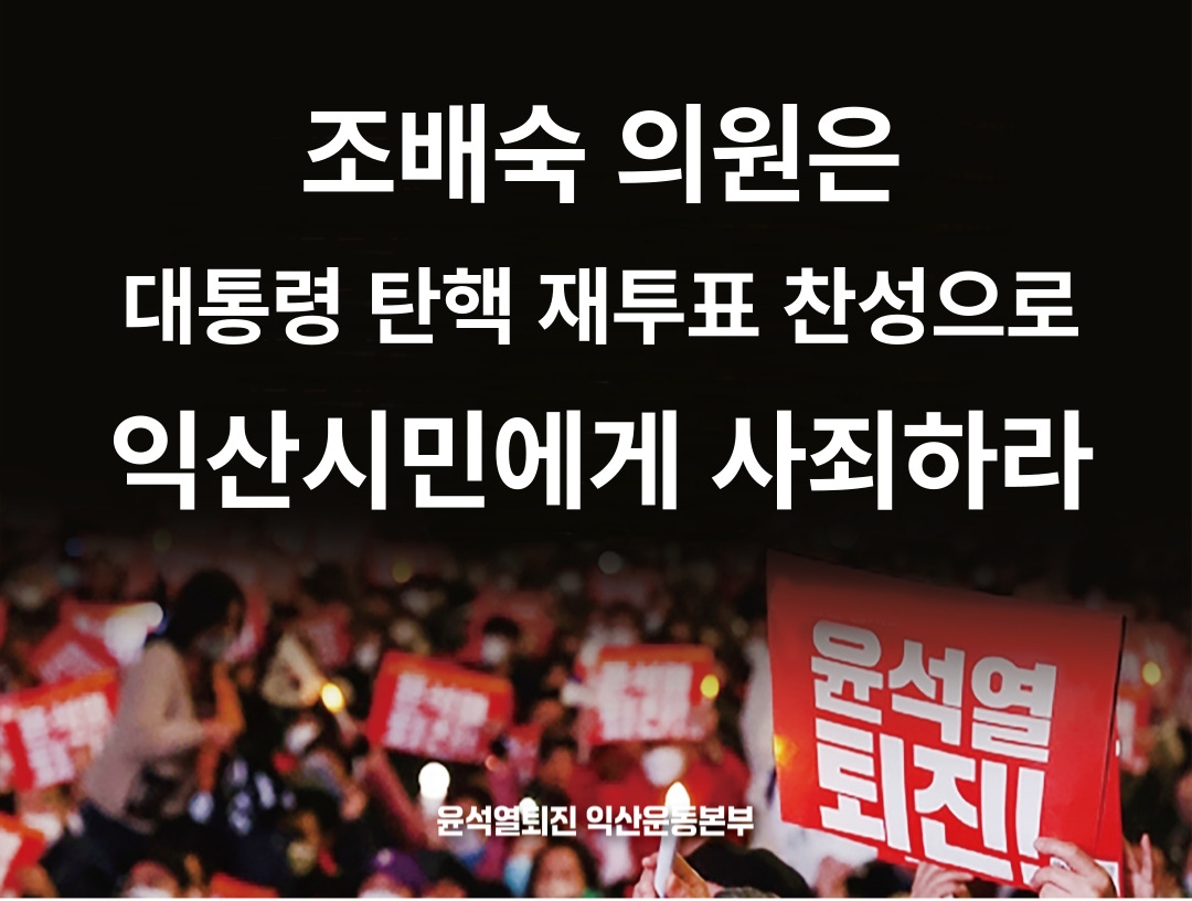 내란 동조자를 자임한 조배숙 의원은 역사에 기록될 것이고, 익산시민도 절대 잊지 않을 것이다. 익산시민은 마지막으로 조배숙 의원에게 명령한다. 12월 14일 국회에 상정될 대통령 탄핵안 재투표 찬성에 적극적으로 참여해야 한다. 이것 만이 익산시민에게 사죄하는 유일한 길임을 명심하기 바란다. 익산시민은 두 눈 부릅뜨고 지켜볼 것이다.