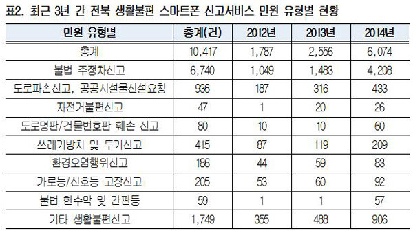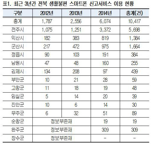 최근 3년간 전북 14개 시군에서 생활불편 스마트폰 신고서비스를 이용한 건수는 이 제도가 첫 시행된 2012년 1,787건에서 4,287건이 증가한 2014년 6,074건으로 3년 동안 총 10,417건에 이르고 있습니다.