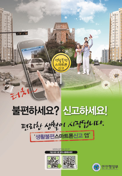 그동안 생활 속에서 겪었던 다양한 불편함을 참기만 했다면, 이제는 간단하고 쉽게 신고하여 처리할 수 있는 방법이 있습니다. 행정자치부의‘생활불편 스마트폰 신고’앱을 다운받아 설치하여 사용할 수 있습니다.