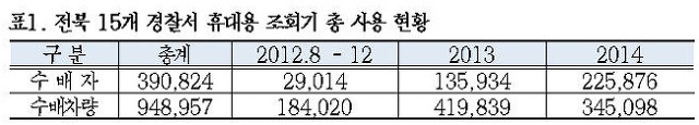 최근 29개월 동안 전북 경찰관들이 휴대용 조회기를 통해 신원(차량)을 조회한 총 건수는 수배자 39만824건과 수배차량 94만8957건으로 월평균 898건(수배자), 2천181건(수배차량) 하루평균 29건(수배자), 72건(수배차량)에 해당하고 있다.