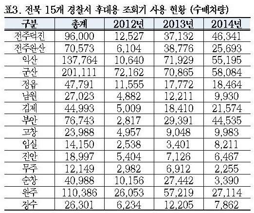 최근 29개월 동안 15개 경찰서별로 수배차량 차량조회를 살펴보면 군산 20만1111건으로 가장 많으며 익산 13만7764건, 완주 11만386건, 전주덕진 9만6000건, 부안 7만6743건, 전주완산 7만573건 순 이며 무주 1만2149건으로 가장 적다. 이는 월평균으로 군산 6천934건, 익산 4천750건, 완주 3천806건, 전주덕진 3천310건, 부안 2천646건, 전주완산 2천433건, 무주 418건에 해당하며, 하루 평균으로 군산 231건, 익산 158건, 완주 126건, 전주덕진 110건, 부안 88건, 전주완산 81건, 무주 13건에 해당하고 있다.
