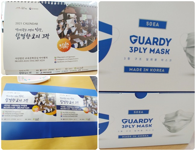 교육문화중심 아이행복에서 탁상달력과 마스크를 제작해 보내주셨습니다